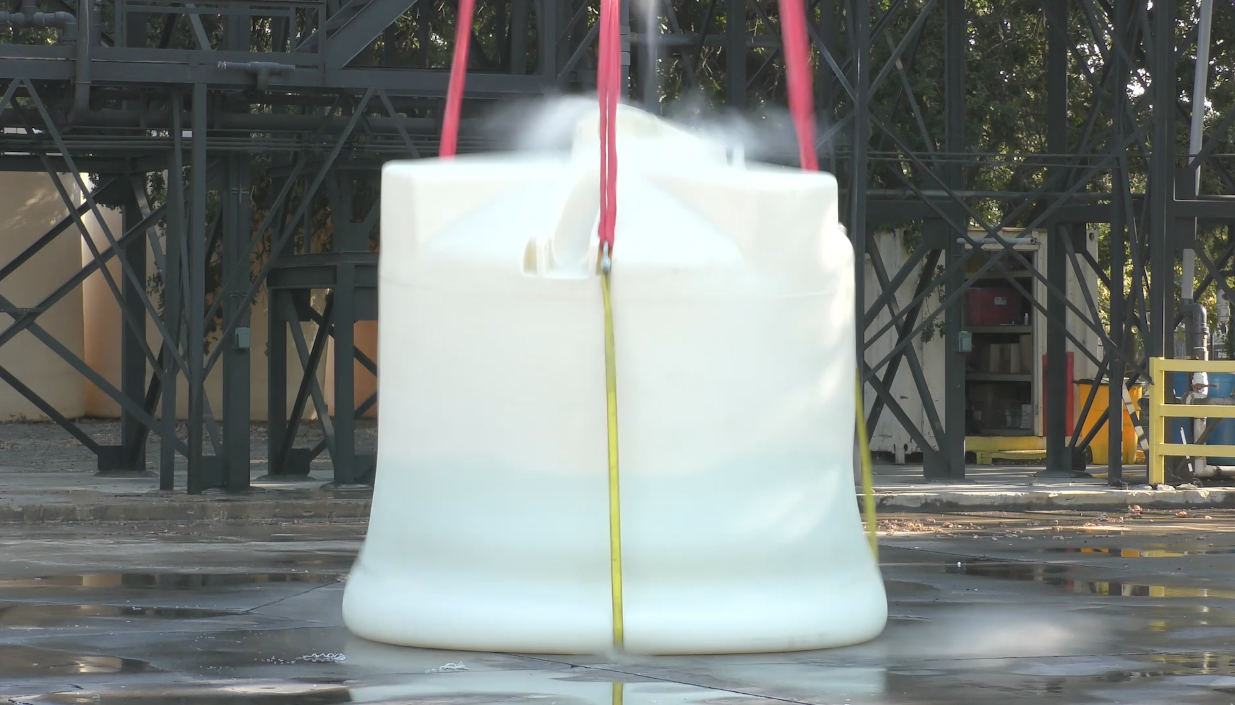We then filled the exact same Poly Processing Crosslinked Tank, the same tank that had just been dropped, but this time with 11000 pounds of water. That’s over 15 times the weight of an empty tank. We dropped it from the same height, to the same surface with the same results, no damage to the tank