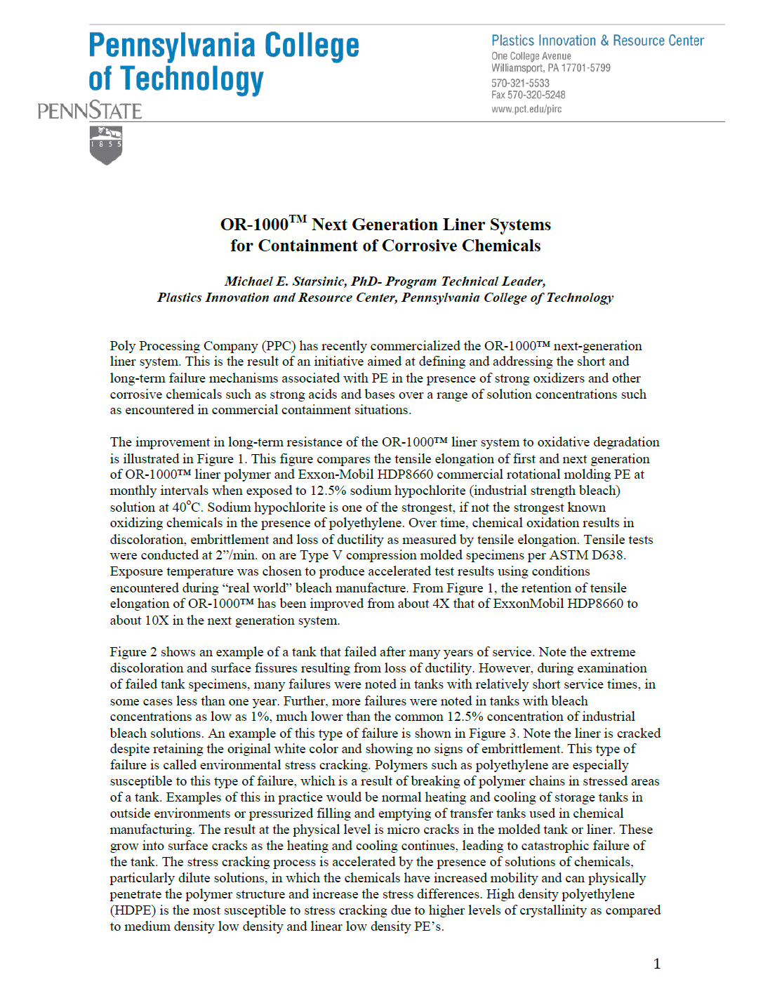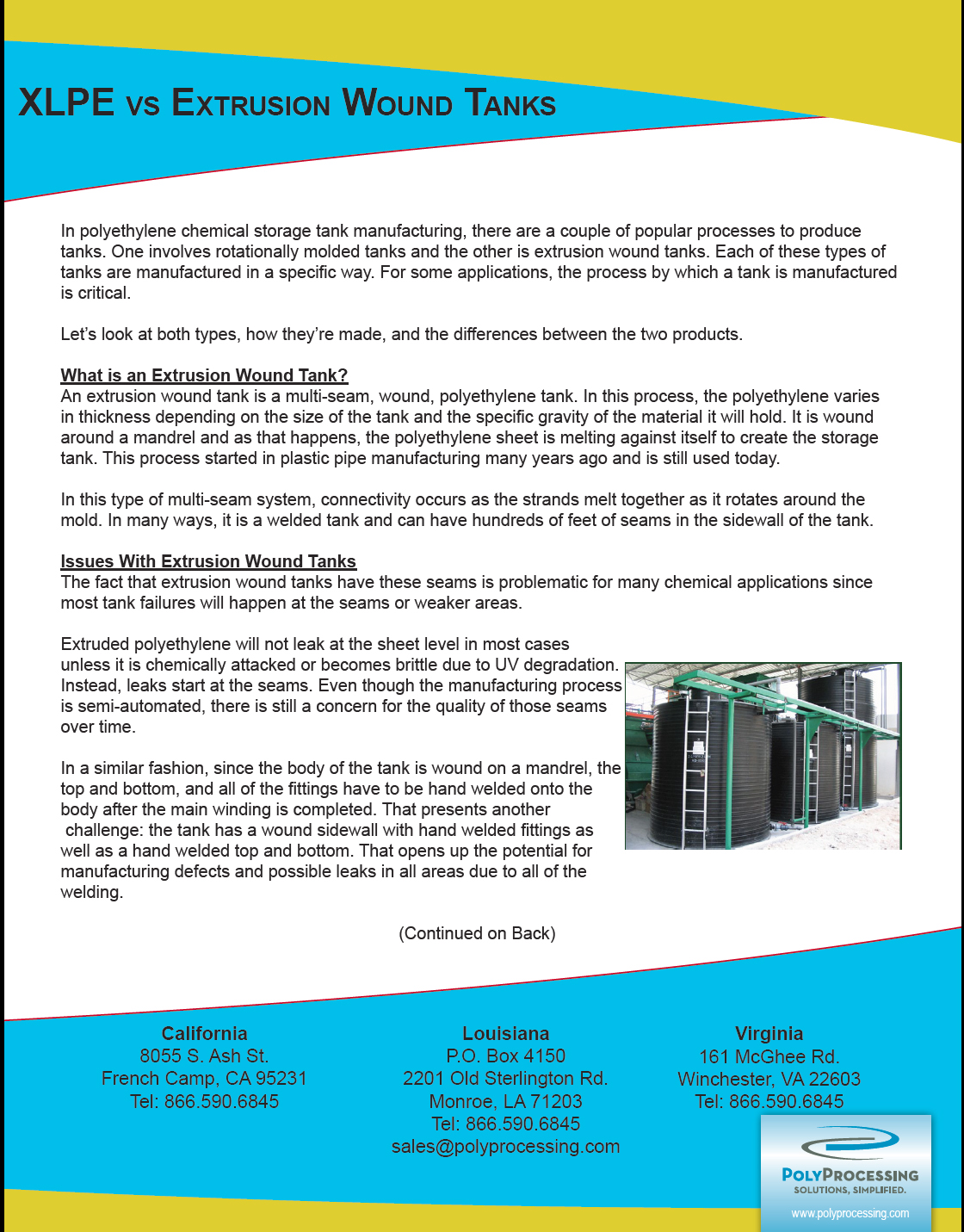 The first test in this comparative study was the drop test. Each tank in the first set was filled with 7000 pounds of water, and lifted with a crane, one at a time, to a height of 15 feet. This height is comparable to that used in the testing of polyethylene drums used for fuel storage. Once the rotomolded tank reached the desired height it was released and allowed to free-fall onto the concrete surface below. This catastrophic failure and its associated crack propagation appeared to be consistent with the un-zipping characteristic found in linear polyethylene resin grades. On the other hand, the cross linked polyethylene tank did not fail or develop any cracks.
